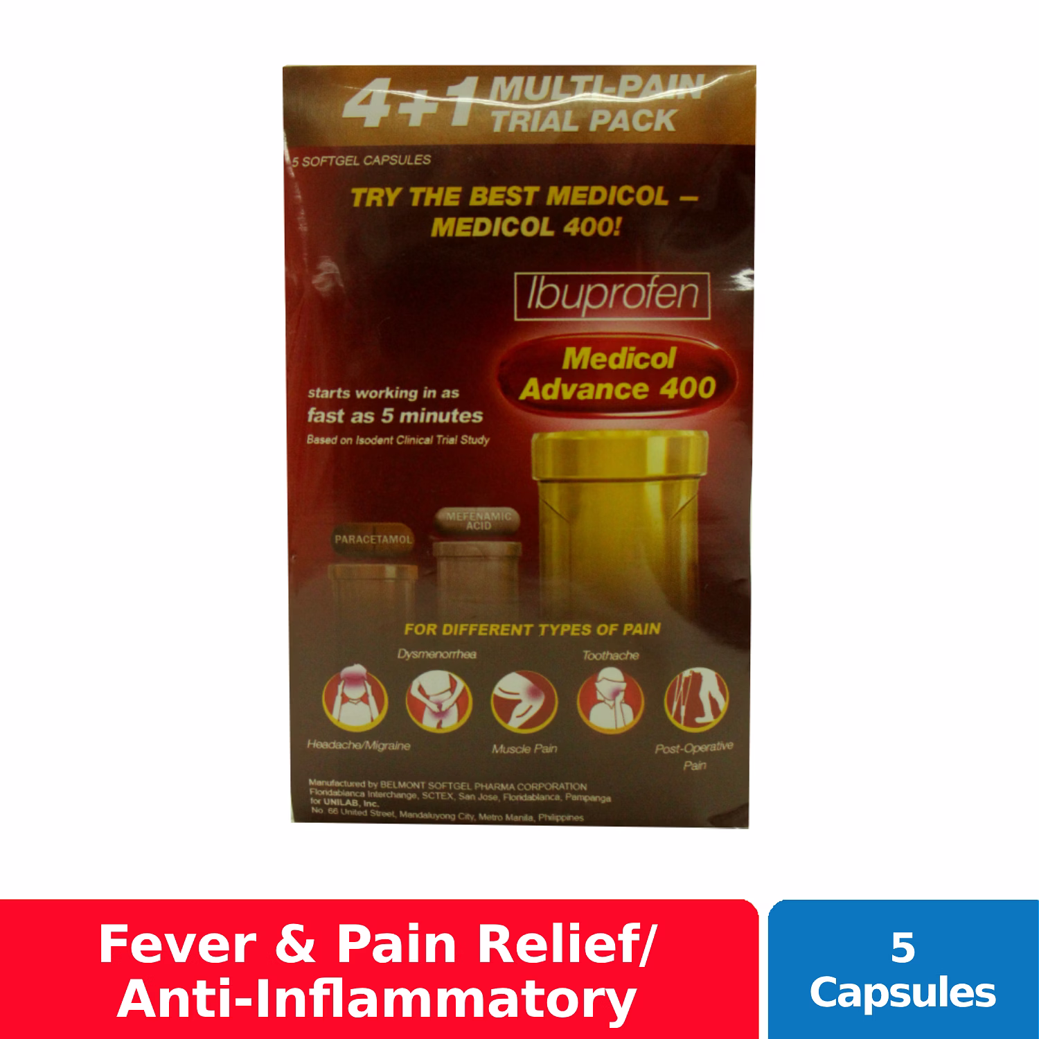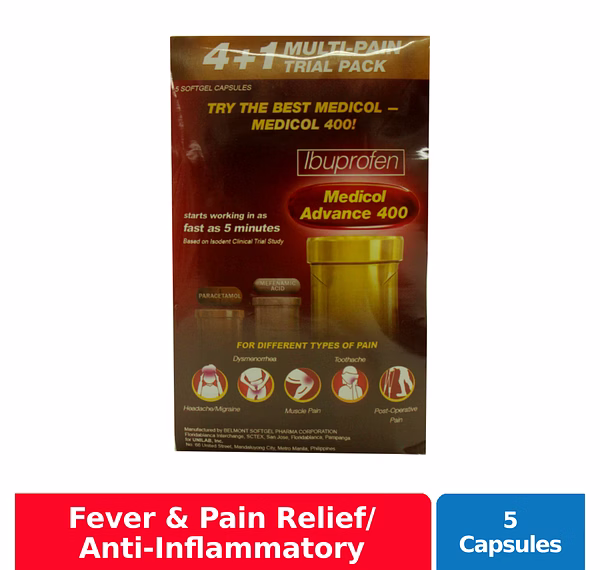 Medicol Softgel is a red, transparent softgel capsule containing a clear, red solution. This medicine is used for the relief of headache; relief of toothache, muscular aches, minor arthritis pain, backache, minor aches and pains associated with the common cold, and pain of menstrual cramps (dysmenorrhea); and also used for fever reduction.