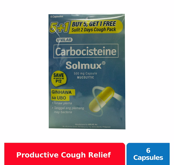 Solmux Capsule is a hard gelatin capsule with ivory opaque cap and rich yellow opaque body. This medicine is the trusted cough with phlegm solution that is scientifically proven to: melt phlegm, making it less thick and sticky, expel phlegm with bacteria, and, stop excess production of phlegm.