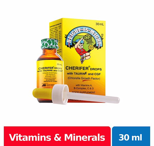 Cherifer Drops is the vitamin preparation packed with Chlorella Growth Factor (CGF) to maximize children’s growth potential. It also contains 150% RDA of Vitamin C for increased resistance against infection as well as serving as an excellent antioxidant needed for growth, development, and maintenance of healthy gums.