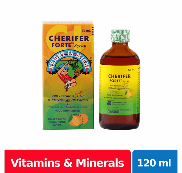 Cherifer Forte Syrup is the vitamin preparation fortified with double Chlorella Growth Factor to maximize growth potential and provide cell nourishment. It also has Taurine that helps with the mental development of children.