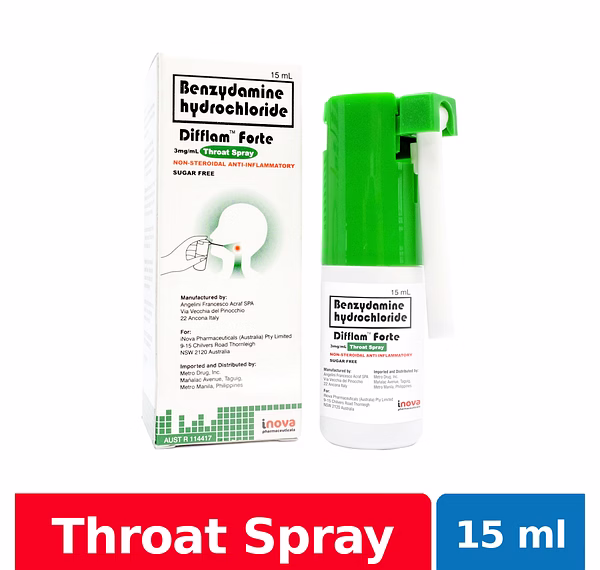 Difflam forte spray is used for the temporary relief of painful conditions of the mouth & throat including tonsillitis, sore throat, radiation mucositis, aphthous ulcers, pharyngitis, swelling, redness, inflammatory conditions, post-orosurgical & periodontal procedures.