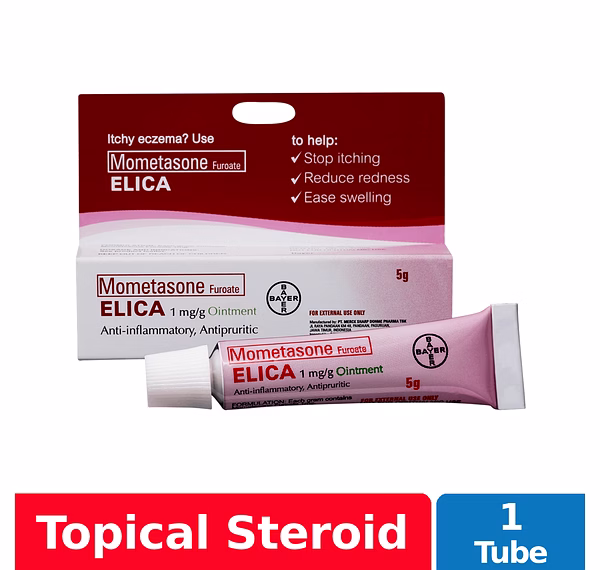 Mometasone furoate (Elica) Ointment 5g is a mid-potent topical steroid that offers relief from itchy dry eczema - For Eczema, psoriasis, and other skin dermatitis - Skin asthma - atopic dermatitis - Itchy rash - dry rash Use once daily and be relieved of eczema symptoms in as fast as 24 hours.