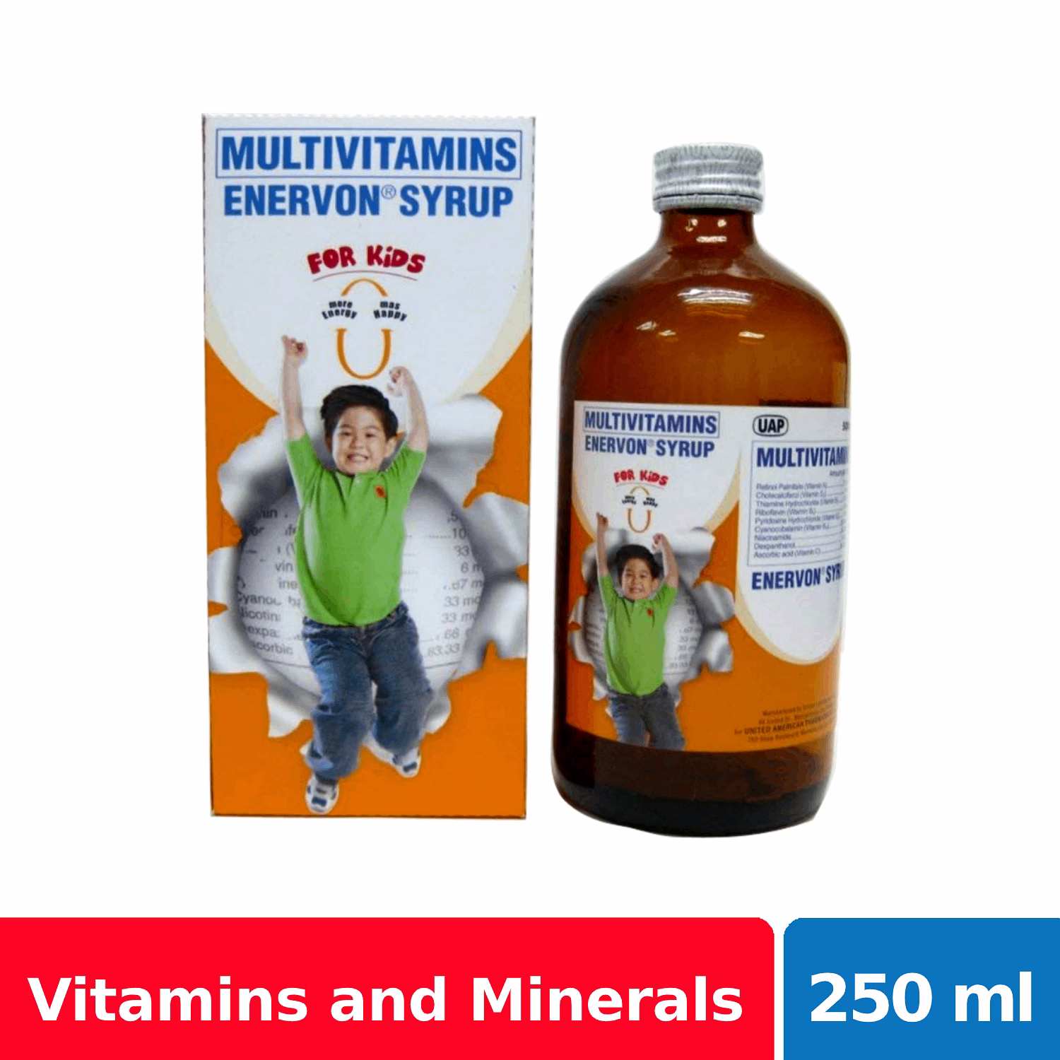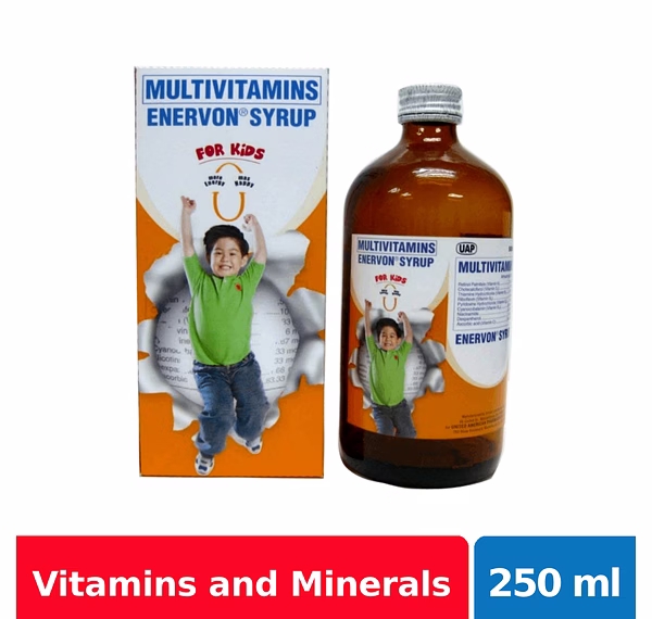 Enervon Syrup is a yellow-colored, orange-flavored clear syrup. It is a children's multivitamins that contains essential nutrients Vitamins A, B Complex, C and D for extra energy and strong immunity to ensure that children stay active, lively and free from sickness everyday.