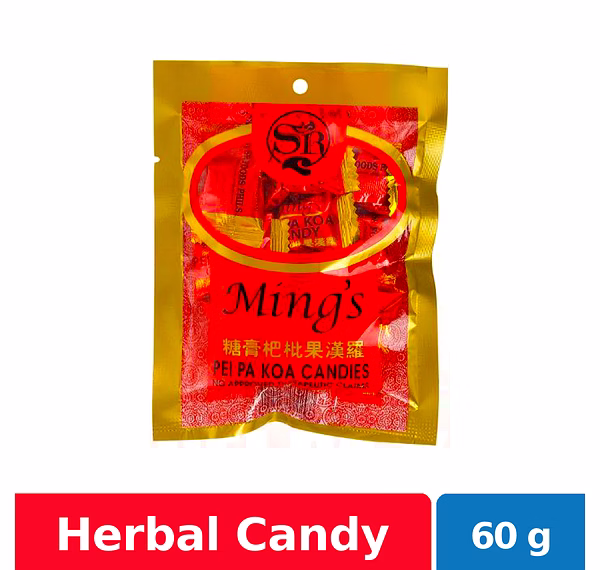 Ming's Pei Pa Koa Candy helps to relief of sore throat, cough, hoarseness, and loss of voice. It also helps prevent dryness of throat from smoking, alcohol drinking and late night fatigue.