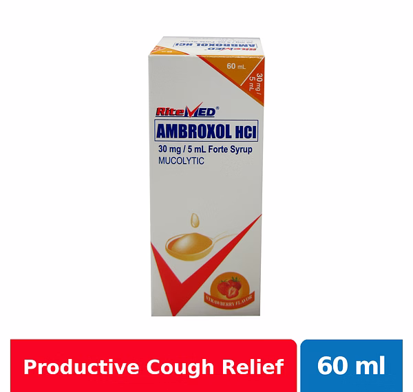 RiteMed Ambroxol Forte Syrup is a strawberry-flavored syrup which stimulates fluid secretion in the respiratory tract and breaks down mucus resulting in the production of less thick and less sticky mucus/phlegm. It improves mucociliary clearance (mucus flow and transport) making phlegm easier to cough up and expel.