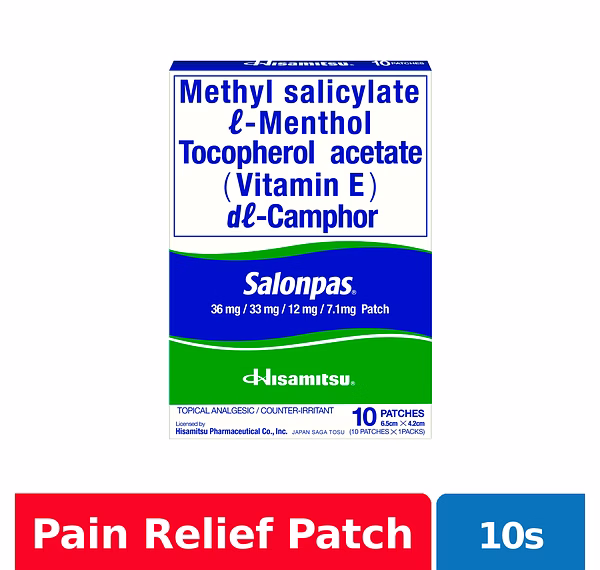 Salonpas Patch is used for the relief of aches, pains, and inflammations associated with muscle fatigue, muscle pain, stiff shoulder, simple backache, bruises, sprains, strains, arthritis, bone fracture, and minor frostbite.