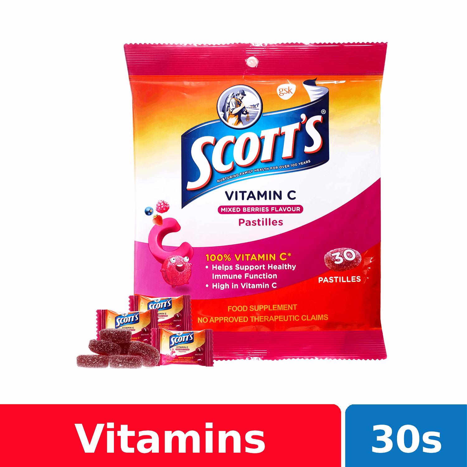 Scotts Pastilles Mixed Berries are high in Vitamin C to help support children's daily immune function, and helps protect them from illness, plus promoting healthy gums and skin.
