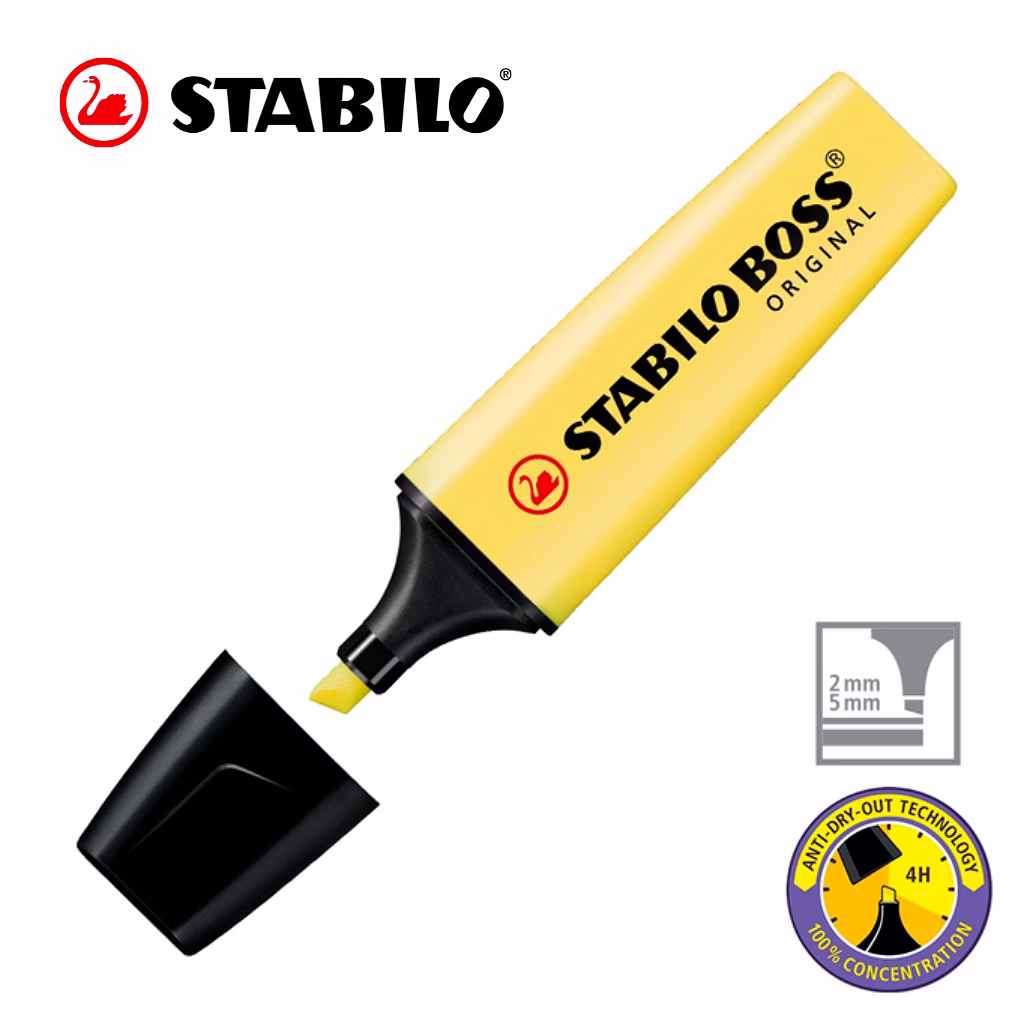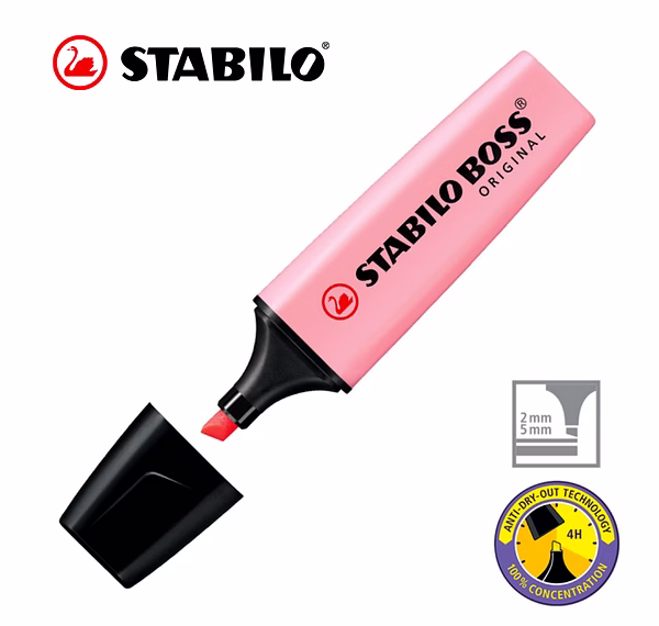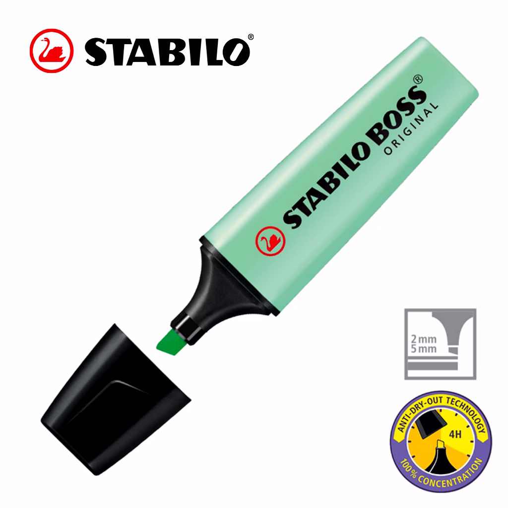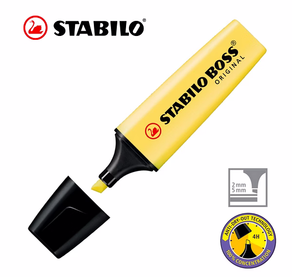 STABILO Anti-Dry-Out technology: 4 hours dry-out protection for concentrated work. 2 line widths 2 + 5 mm – from wide marks for blocks of text to thin lines for annotations, underlining and ruled lines. Water-based ink.