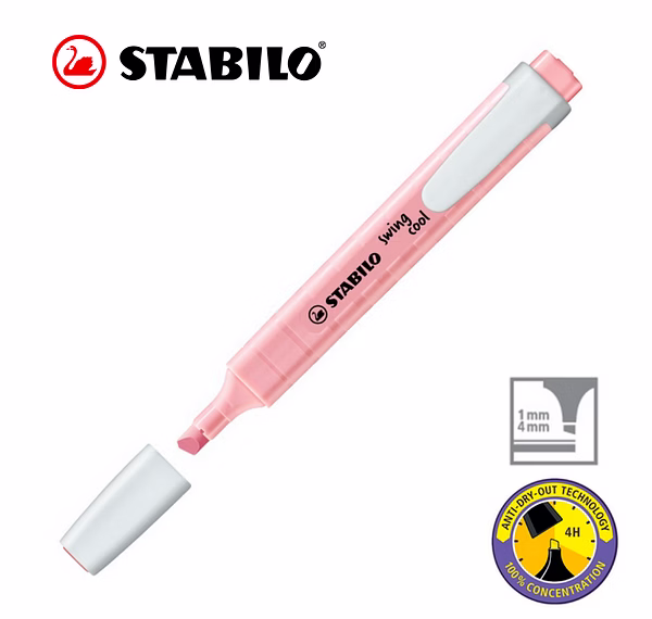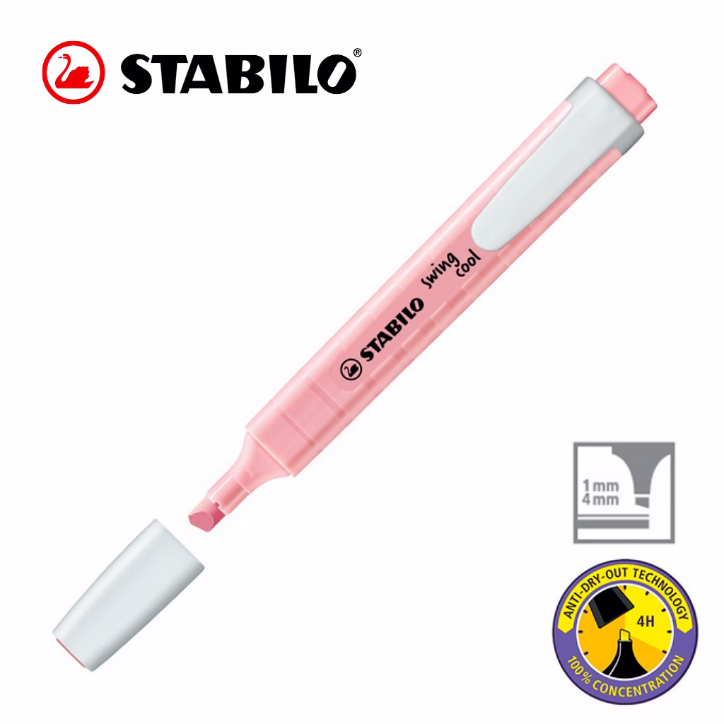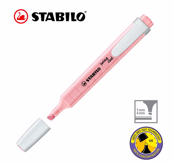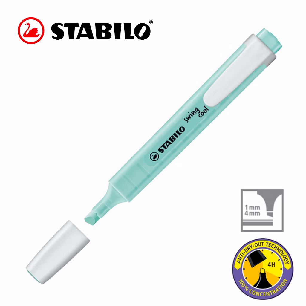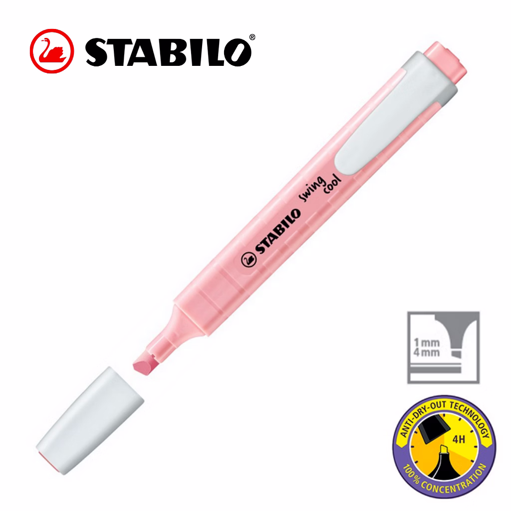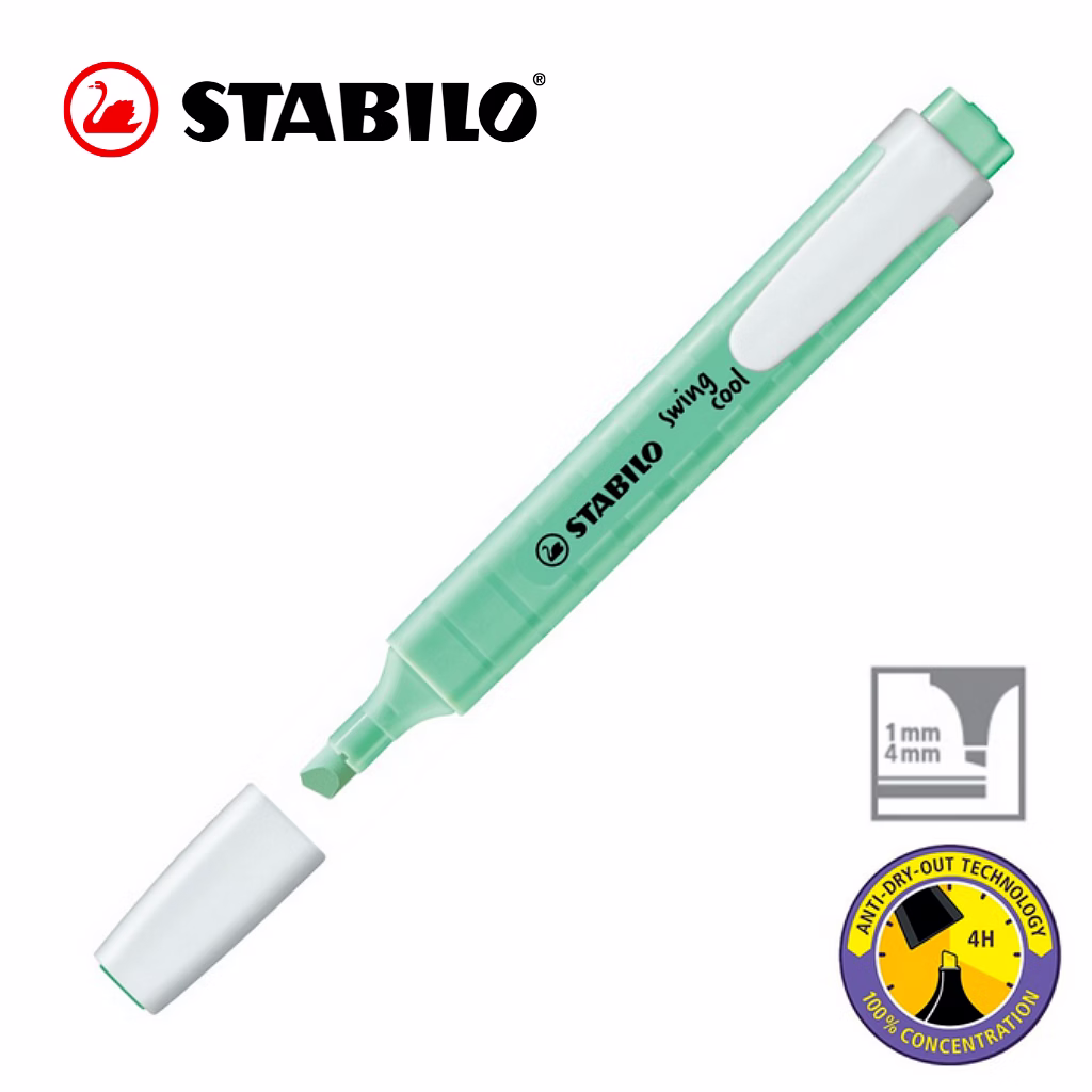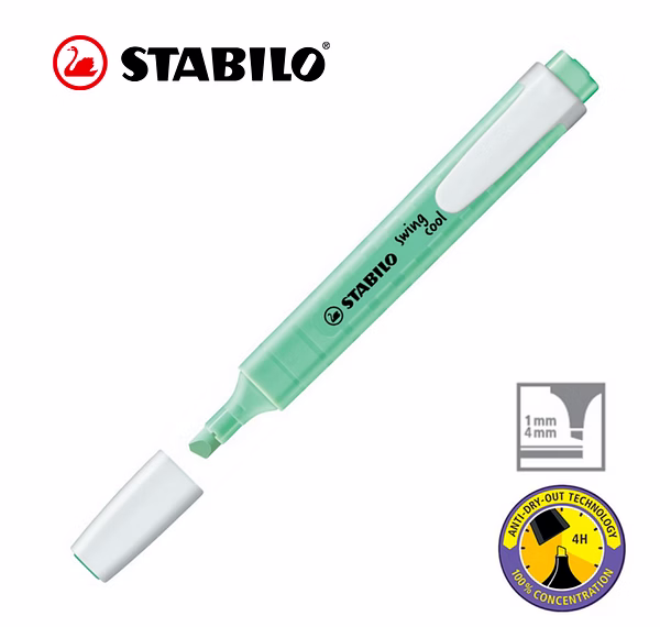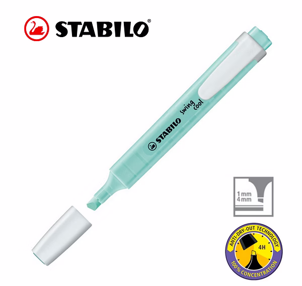 STABILO Anti-Dry-Out technology: 4 hours dry-out protection for concentrated work. Flat pocket-sized highlighter with a practical clip. STABILO swing cool Pastel out of their pocket can show off a practical and highly stylish accessory that will catch everyone’s eye. On paper and in their hand.