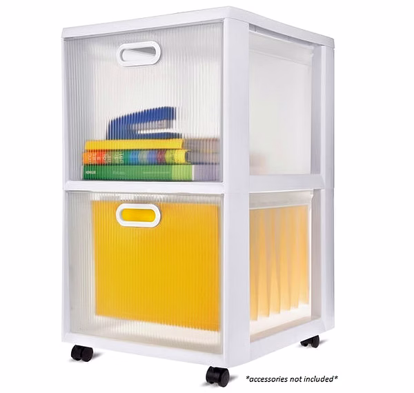 This practical and versatile storage solution features clear, stylized, textured drawer fronts with clear sides that allow items to be quickly identified. The attractive styling makes them an ideal organizing solution for any area around the home including living rooms, bedrooms, offices, and more. Keep your files organized and easy to find when neatly hung in the Ultra™ Cart's deep drawers. Or use the drawers to keep paper, craft supplies, accessories, and office / school supplies contained. Use the included casters to create a rolling storage option, and easily move the Drawer Cart wherever it is needed.
