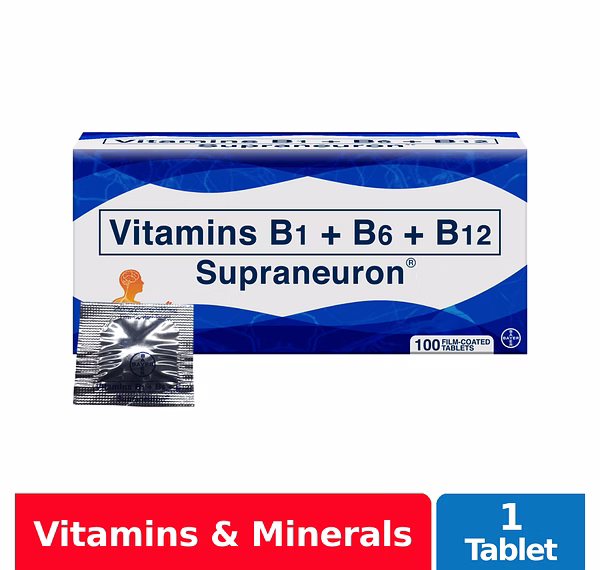 Supraneuron Tablet contains Vitamin B1, B6 and B12 which are essential catalysts in the synthesis, degredation and utilization of carbohydrates, amino acids and fats. The complimentary and synergistic actions of these 3 vitamins are very evident in their antineurotic effect. In fact, their deficiency or absence provokes the recurrence of neuropathies.