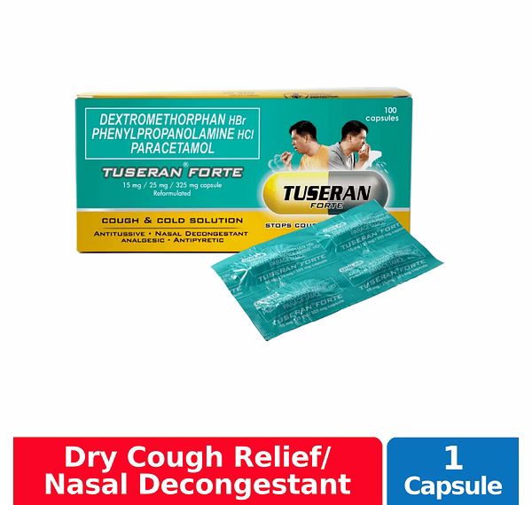 Tuseran Forte Capsule is a hard gelatin capsule with gray opaque cap, printed with “Medichem” logo and yellow opaque body printed with “TUSERAN FORTE”. This medicine is used for the relief of cough, clogged nose, postnasal drip, headache, body aches, and fever associated with the common cold, sinusitis, flu, and other minor respiratory tract infections. It also helps decongest sinus openings and passages. It has a powerful formulation made especially for cough and cold. It can provide relief in as fast as 15 minutes!